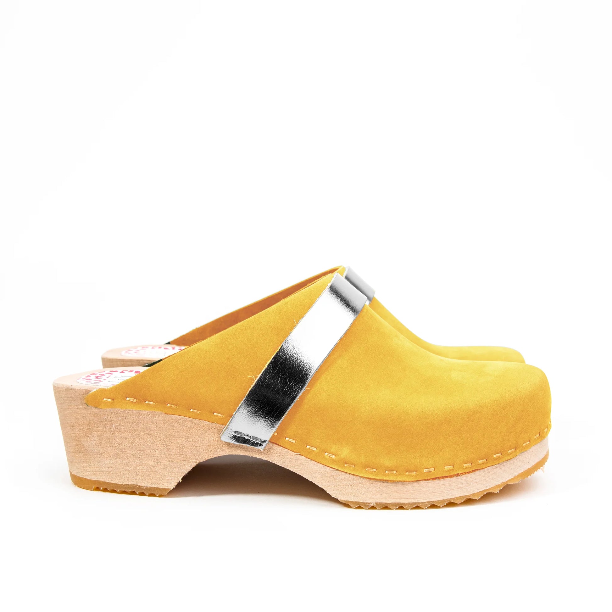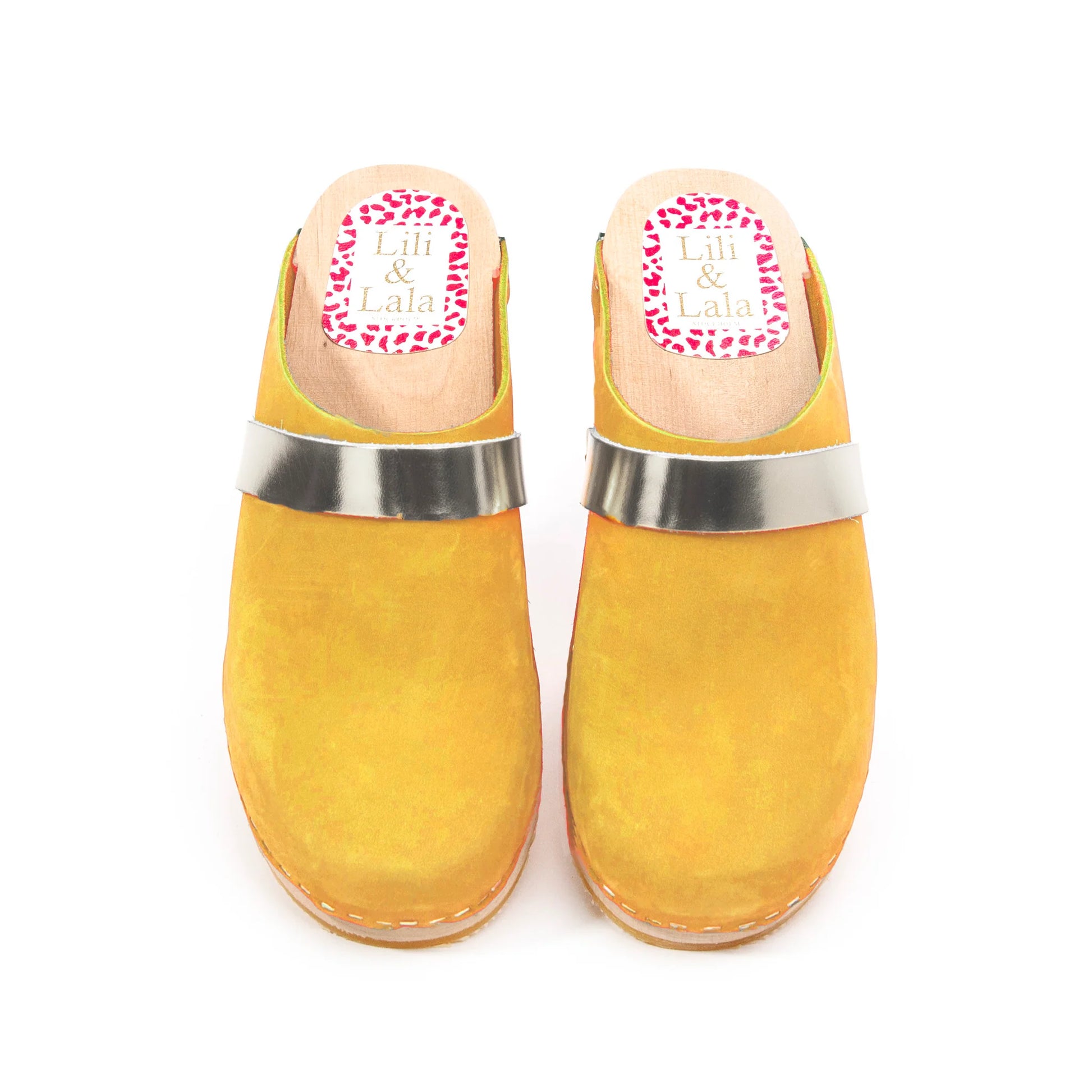 Classic Style! These trendy handmade Lili & Lala clogs are designed for the trendy yet classic woman. Featuring mustard nubuck leather and a silver strap, with a natural wood platform. You won't want to stop wearing these beautiful clogs.