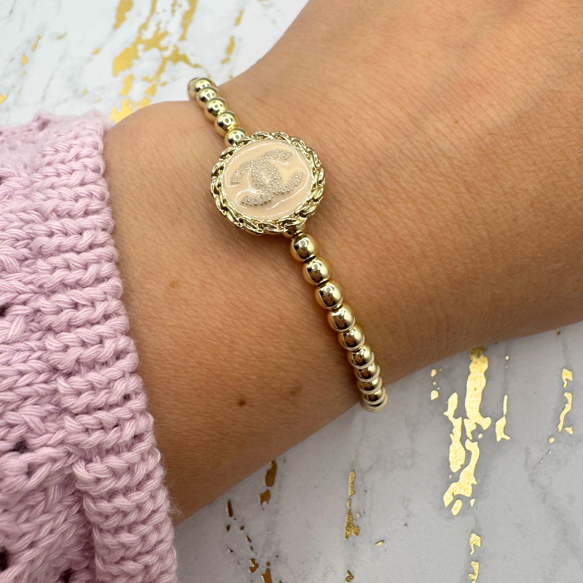 Refined elegance! This Golden Girl bracelet, thoughtfully crafted from repurposed Chanel vintage buttons sourced from cherished preloved pieces. The sophisticated design features professional-grade elastic cord that glides effortlessly onto your wrist while maintaining exceptional durability. Engineered for everyday wear—resistant to sweat, water, and tarnish—this bracelet seamlessly transitions from day to evening. Each piece is handcrafted with meticulous attention to detail, and with limited availability and uncertain restocks, owning this timeless accessory is a must.