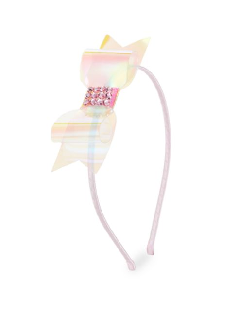 Adorable and Cute! Give your little princess this crystal embellished light pink translucent bow with a multicolor finish that lends a mystical effect to this headband.