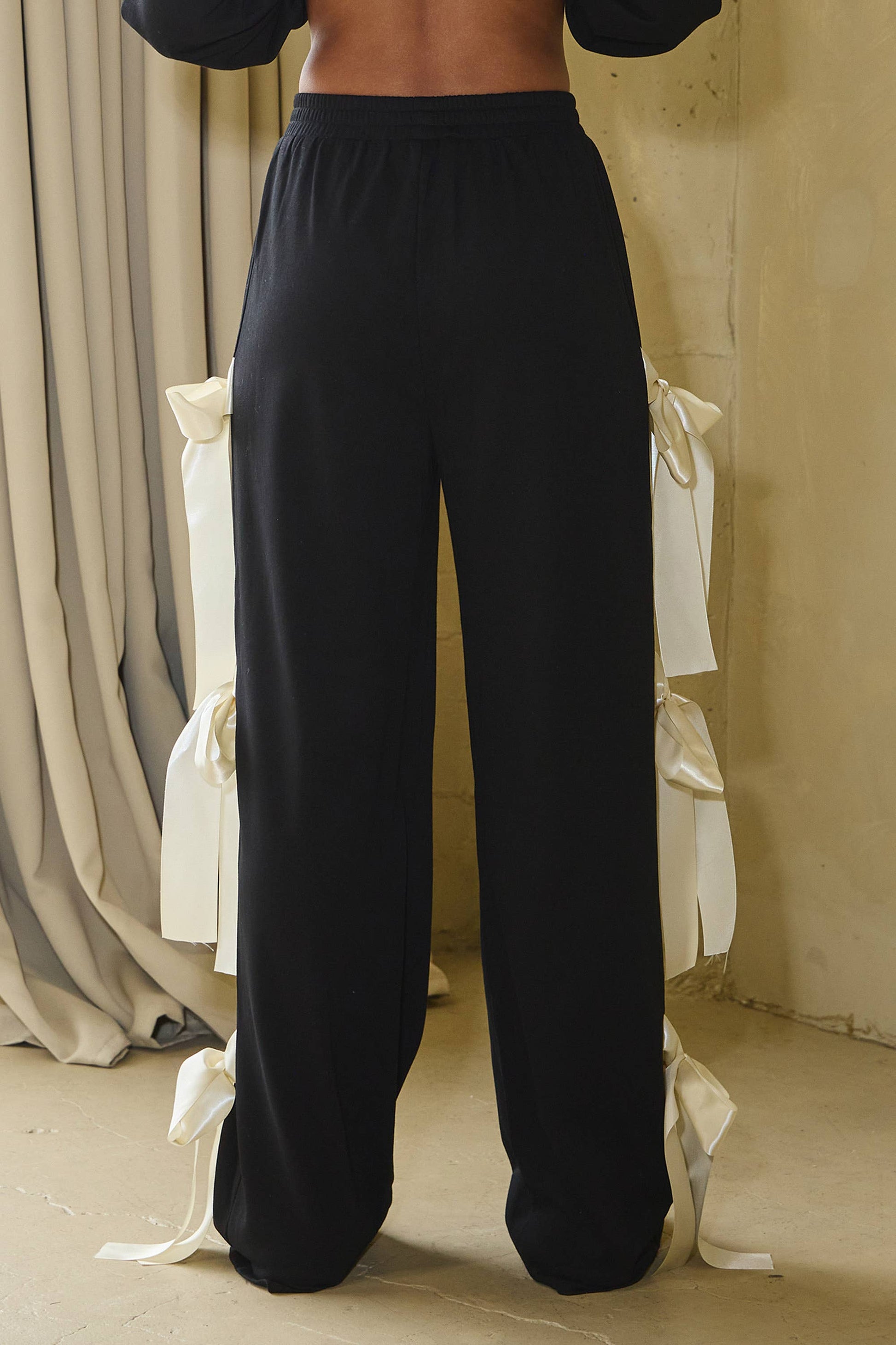 No Vacancy Women's Black French Terry Wide-Leg Pants with Satin Bow Ties