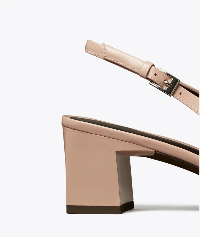 Sophisticated Style! Chic and sophisticated, the Tory Burch Georgia Slingback Pump offers a timeless silhouette with a modern edge. Designed in a soft pink brick hue, this style features a square pointed toe, sleek hardware detailing, and a refined slingback strap with a buckle closure. The heel adds just the right amount of lift for all-day elegance.