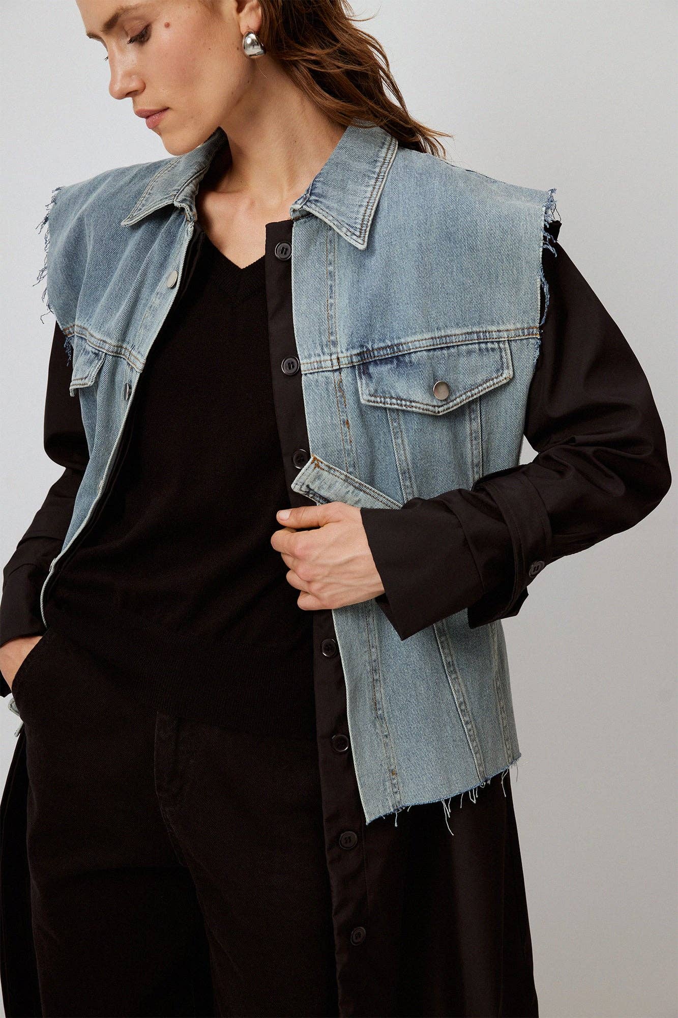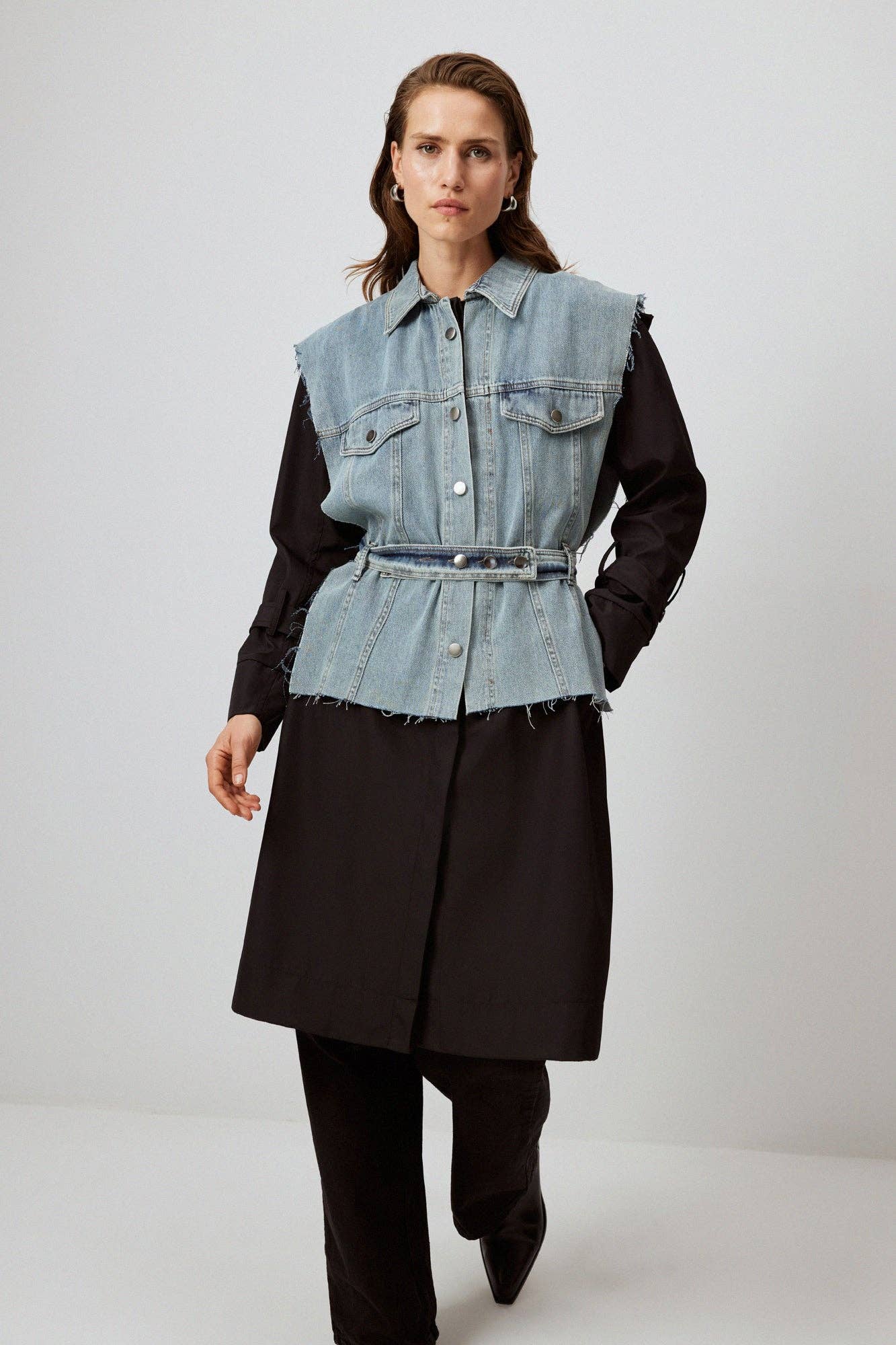 Denim X Fabric: The Ultimate Trench Coat! Elevate your style with this chic long trench coat from Touché. Featuring a trendy mixed-media design that blends denim and fabric, this coat is a true standout. Finished with a denim belt and eye-catching silver-tone buttons, it's the perfect combination of fashion and function.