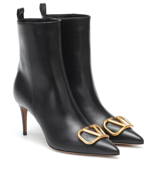 Bold & Fierce! You won't get enough of these sleek pointed toe Valentino Garavani booties. These classy boots feature black leather and matte gold-tone hardware that'll turn heads!