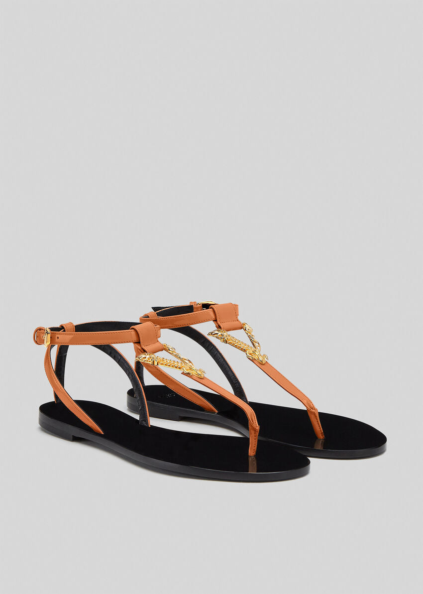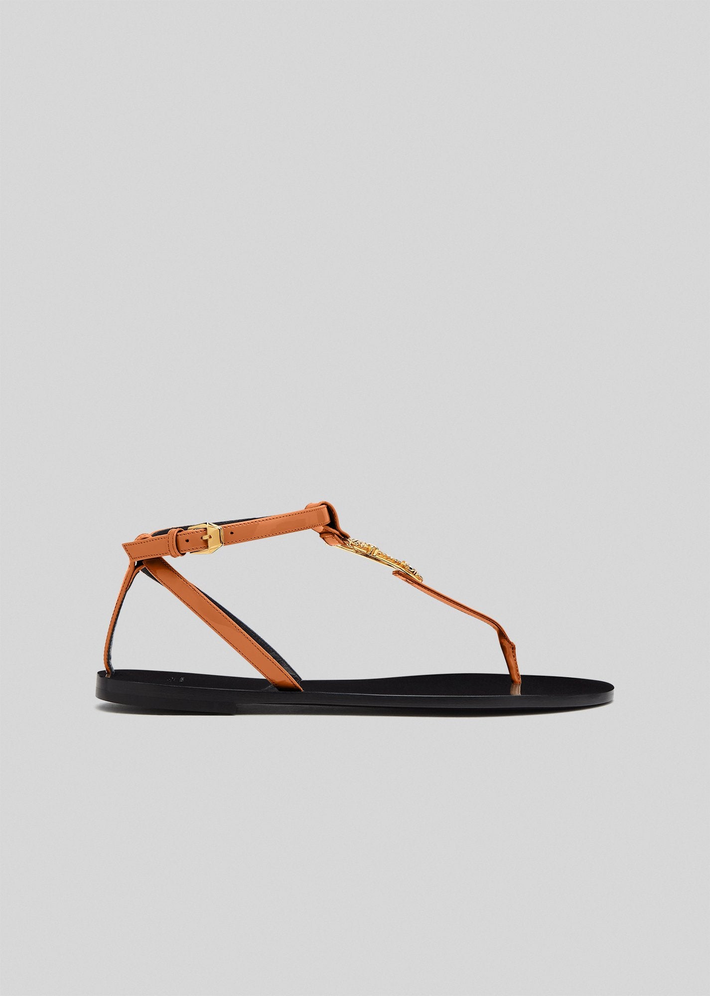 These classy Versace thong sandals with embellished gold-tone Barocco V hardware are crafted from supple leather. Enhance your favorite summer time outfit with these one of a kind sandals.